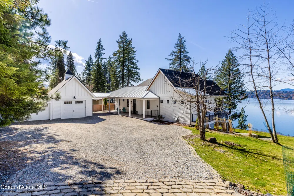 This modern masterpiece is a farmhouse-inspired home crafted for gatherings and entertaining. Overlooking the beautiful Lake Coeur d'Alene, it offers breathtaking sunset views over the water. Built in 2019, this 3,170 square-foot home spans two levels, bathed in natural light with panoramic lake views from almost every room. The finishes are exceptional, embodying understated elegance while offering a peaceful, welcoming atmosphere. In order to complement the lot's surroundings, the layout of the home seamlessly connects to the outdoors. The property features 125 linear feet of waterfront and a deeded dock with three boat slips, conveniently located next to the Centennial Trail and a designated area at the base of the lot to park your car. Equipped with whole-house automation and entertainment systems, this house facilitates remote work, seamless hosting, and easy management. The two-car oversized garage is connected by a breezeway and the oversized laundry room is equipped with ample cabinets and a dog washing station. With minimal exterior maintenance required, it's perfect as a seasonal or year-round retreat. Offering privacy and security, this home provides a serene, luxurious living experience.
