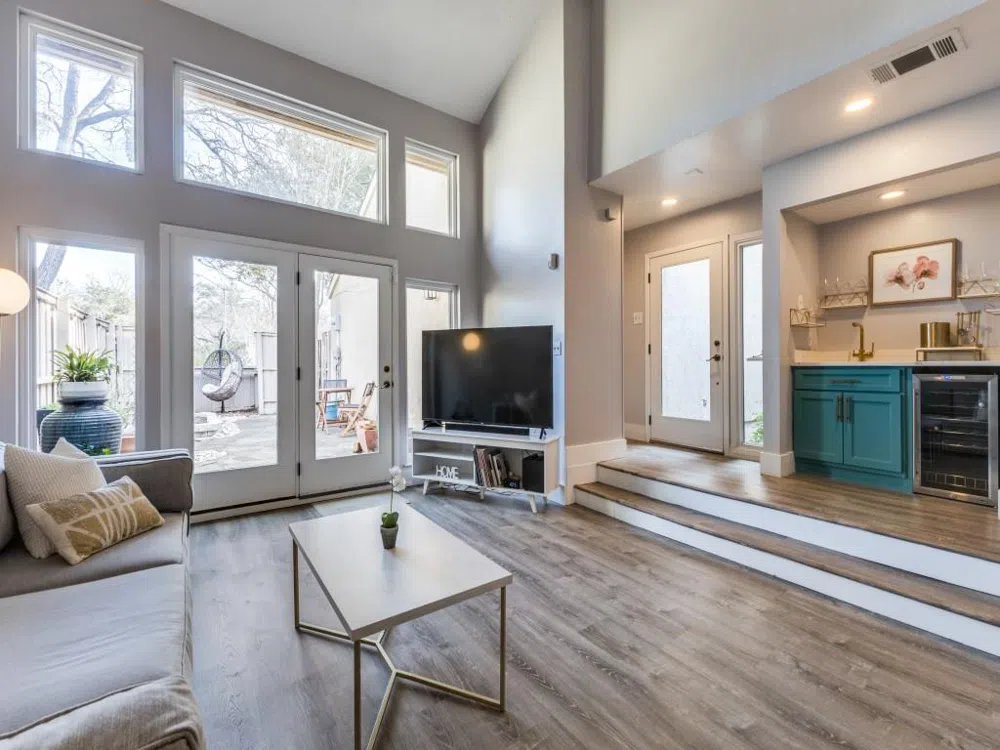Sophisticated, Chic, and Beautifully Updated – A True Gem in Lake Highlands! Welcome to the Patio Homes of Chimney Hill, a serene and picturesque community nestled in the northern Lake Highlands area. This charming neighborhood is tucked away amidst mature trees and offers a quiet, retreat-like atmosphere. This beautifully updated 1970s contemporary designed home is flooded with natural light, providing a sense of warmth and openness throughout. Step inside to discover an inviting open layout, highlighted by soaring vaulted ceilings, two wood-burning fireplaces, and elegant vinyl luxury plank flooring that spans the entire first floor. The spacious sunken living area features an impressive 20-foot plus vaulted ceiling, wet bar and a wall of windows and glass doors leading to a tranquil front courtyard. At the heart of the home is the fully updated kitchen, a true culinary haven. Quartz countertops with striking waterfall edge on the large island peninsula, abundant cabinetry, and ample counter space make this kitchen both functional and stylish. A large single-basin ceramic sink, designer pendant lighting, and a generous pantry round out the thoughtful design. The home offers flexible living spaces, including two guest bedrooms on the main level, and a third guest bedroom along with the spacious primary bedroom on the second level. The oversized primary bedroom easily accommodates a sitting area and is bathed in natural light, creating a serene and inviting retreat. Upstairs, a cozy loft living area with its own wood-burning fireplace is currently used as a fitness space but would also make a perfect home office or reading nook. The outdoor courtyards offer multiple areas to entertain family and friends in style, whether it’s for a casual gathering or special celebration. With a reasonable $220 monthly HOA fee that covers the community pool, and being served by the highly acclaimed RISD, this is a truly exceptional home in a prime location. Do not miss this one!